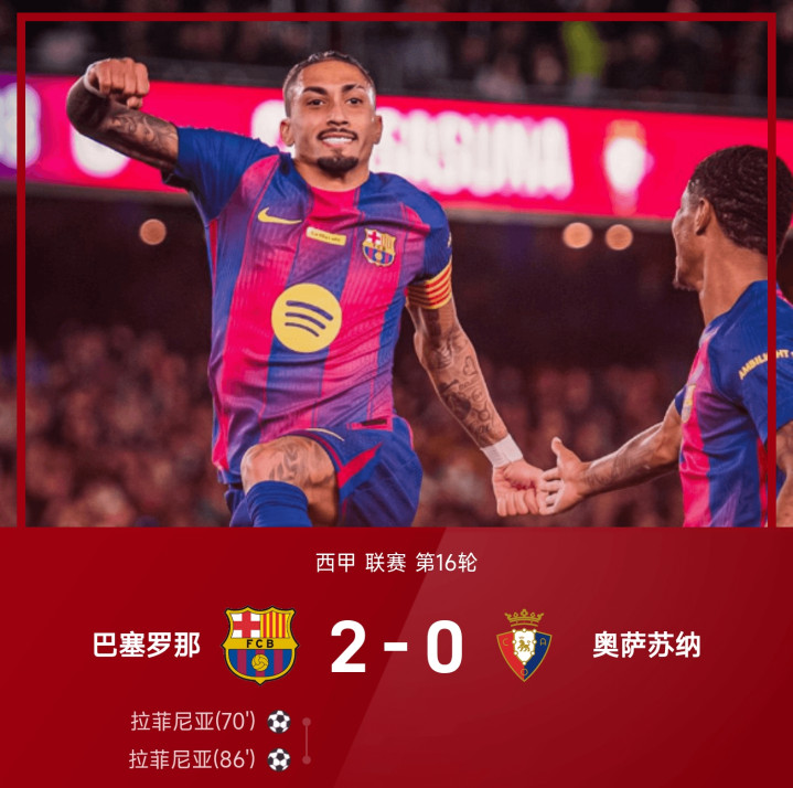 12月14日 25/26赛季西甲联赛第16轮,巴塞罗那主场以2-0轻取奥萨苏纳。上半时比赛,费兰的进球被判无效;下半时比赛,拉菲尼亚奉上双响,助红蓝军团主场班师。巴萨在获取这场比赛的奏效后,暂时以7分起原皇马,无间在联赛里处于领跑。
